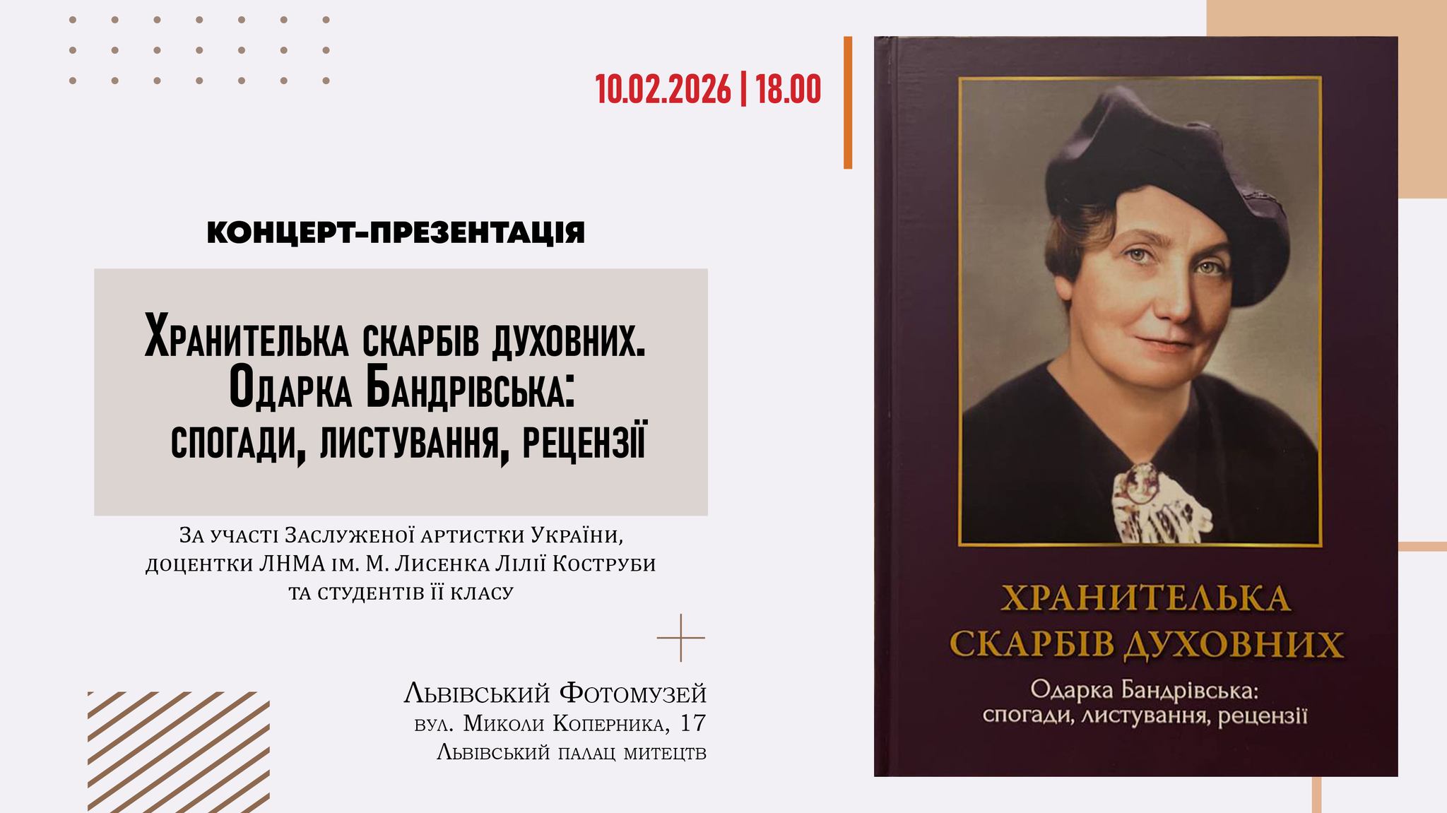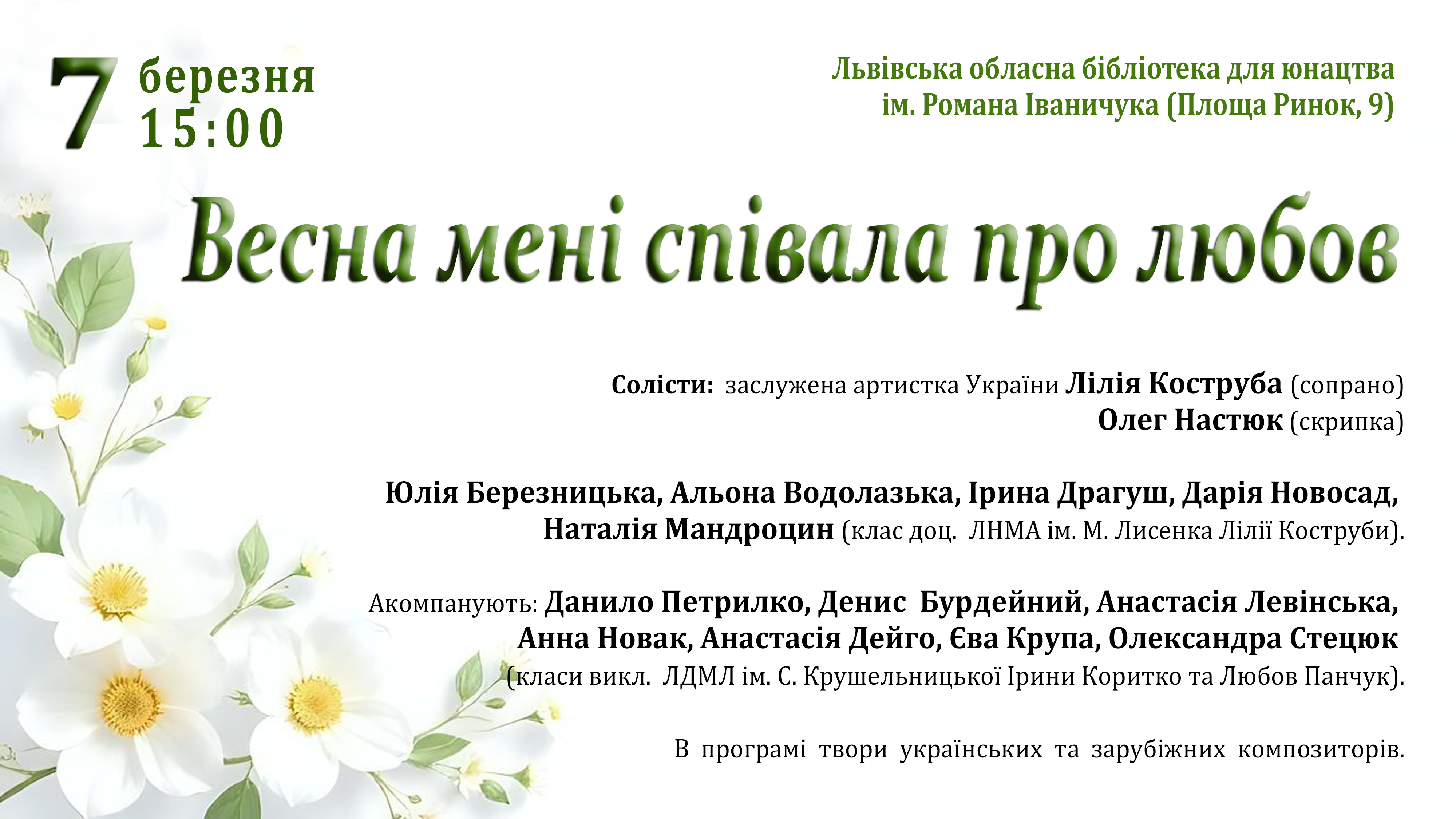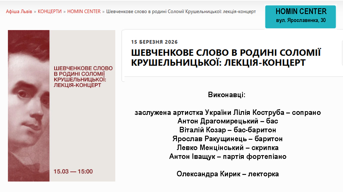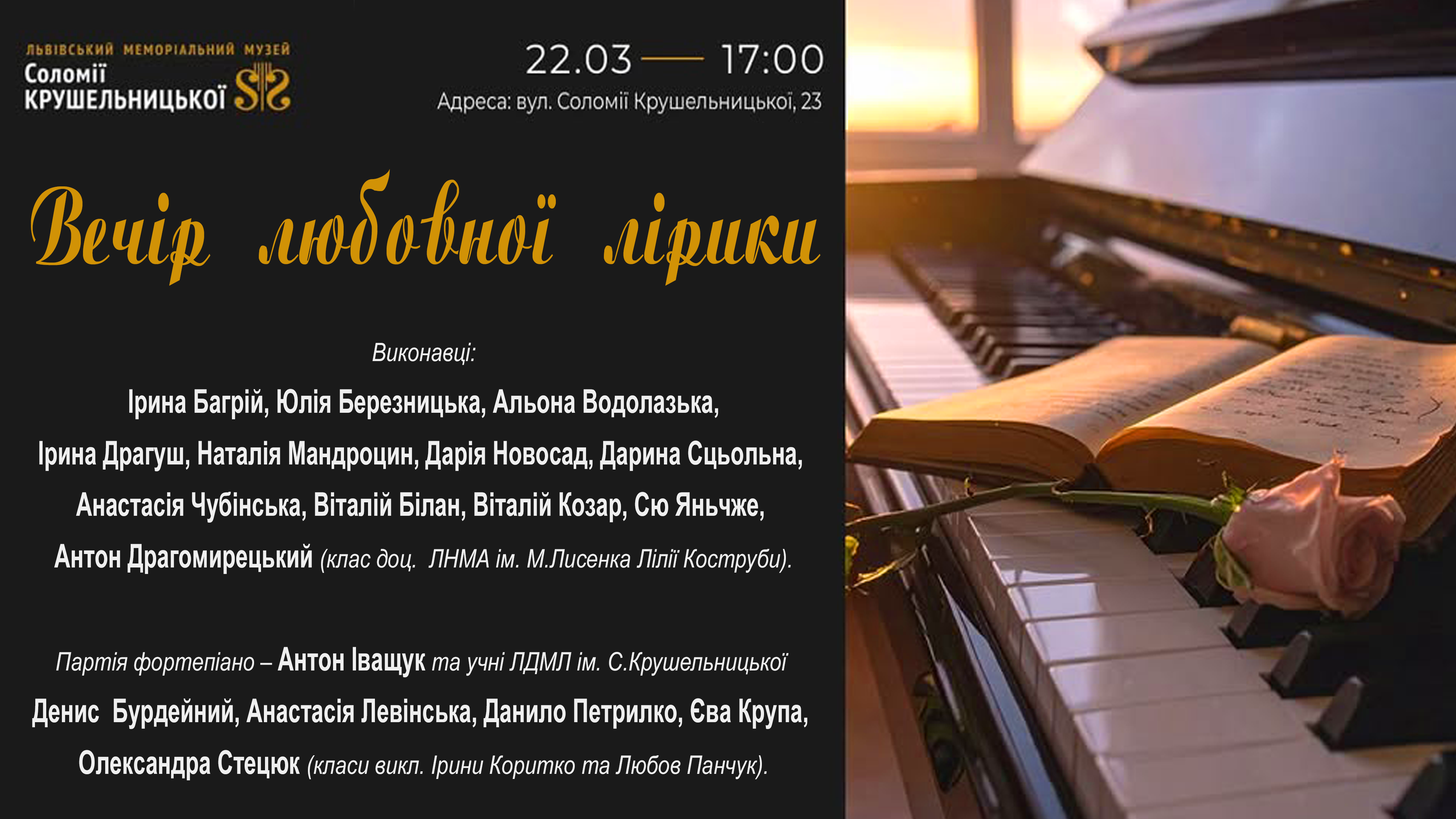22 березня 2026 року відбудеться вечір любовної лірики в Музично-меморіальному музеї Соломії Крушельницької у Львові. Цього вечора молоді виконавці співатимуть про любов так, як відчувають її сьогодні, про щось потаємне, легке й ніжне, про зізнання, сказані пошепки, про музику, яка торкається серця дуже обережно.