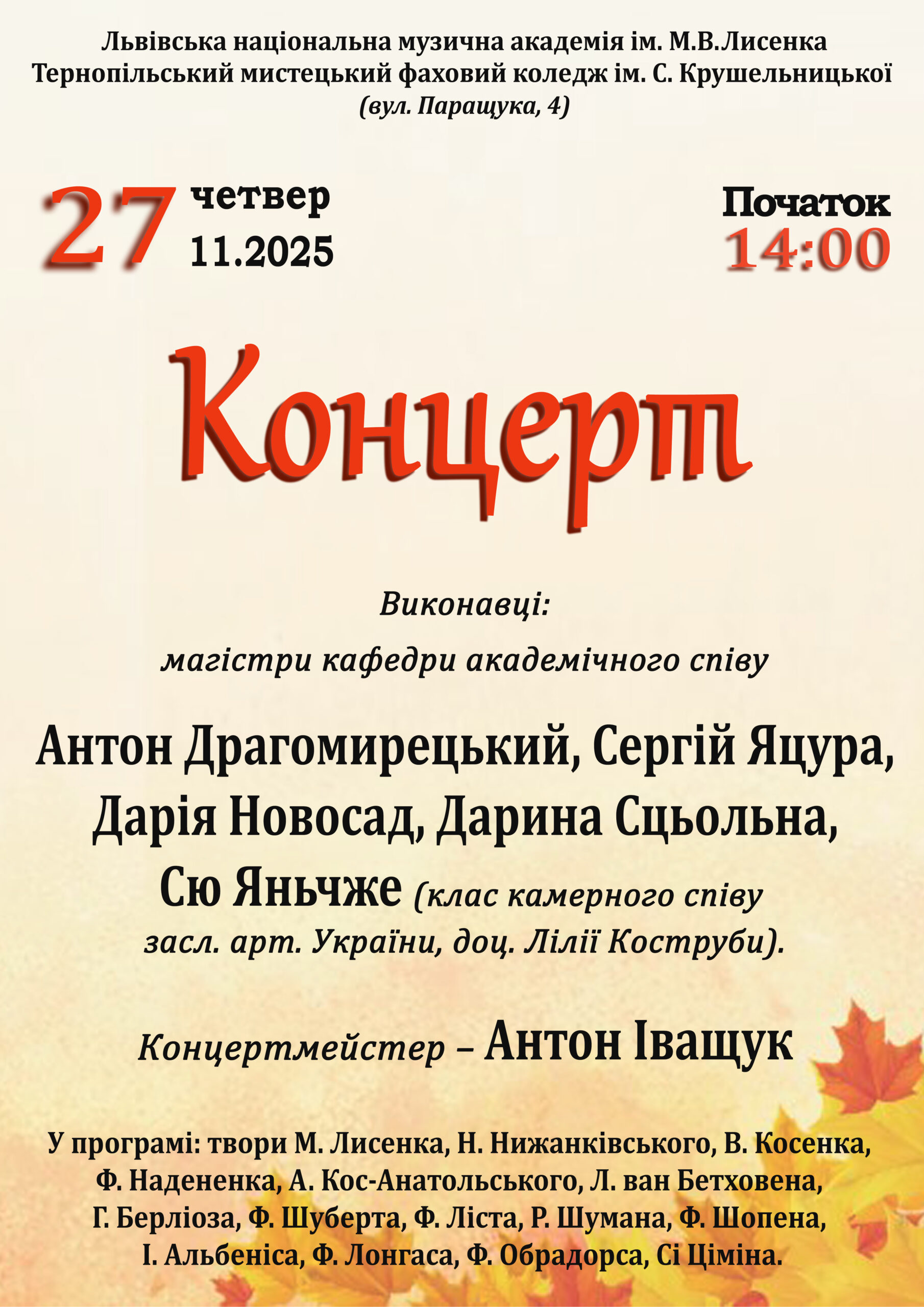 У програмі – твори українських та зарубіжних композиторів.